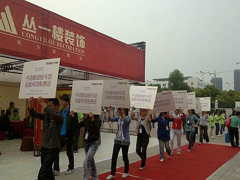 高舉“千店聯動搶今頂,浴室吊頂免費送”標語牌的臨促隊伍進入現場