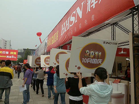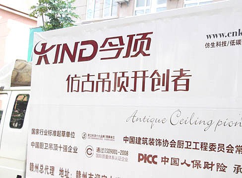 本次交易會上,為了全方位服務到場業主贛州今頂對現場布置做了十足的準備。在外圍,贛州今頂強調今頂“仿古吊頂開創者”的品牌定位,不但豎起大幅噴繪形象,還駕駛流動廣告車到現場助威;而臨促人員高舉“千店聯動搶今頂,浴室吊頂免費送”的國慶標語牌穿行在現場人群中;贛州今頂現場產品出樣也是面面俱到,同時還將店內產品陳列架搬到現場供消費者甄選滿意的商品。贛州今頂在本次交易會上不但賺足了人氣,同時也吸引了無數業主踏足贛州今頂展位。