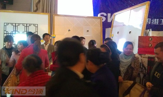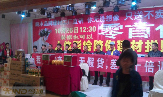 10月26日,在江蘇響水心連心酒店宴會廳,包括今頂復古吊頂、大衛地板、金舵陶瓷等眾多品牌聯合為響水業主奉獻了品牌建材工廠直銷會的團購活動。這次主辦方為了強調品牌產品的美譽特意安排了各個參與品牌集體承諾的環節。