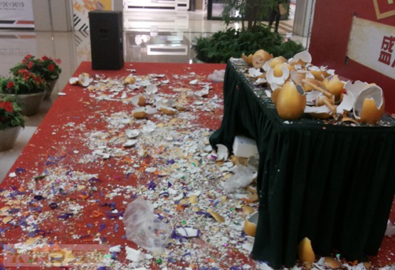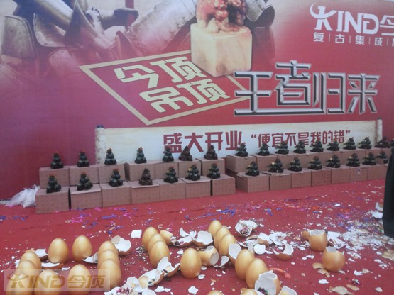 鎮江今頂在開業當天為將要到場簽單業主準備了充足的禮物及各種獎勵。在今頂盛裝開業的形象墻前,今頂為業主準備了上百的待砸金蛋,這些待砸金蛋在“今頂·王者歸來”的形象墻前顯得甚為耀眼。經過鎮江業主的“不懈努力”百余個為業主簽單準備的金蛋被砸的“一片狼藉”,這一場面足以說明鎮江業主對今頂復古吊頂以及這個品牌的熱愛!