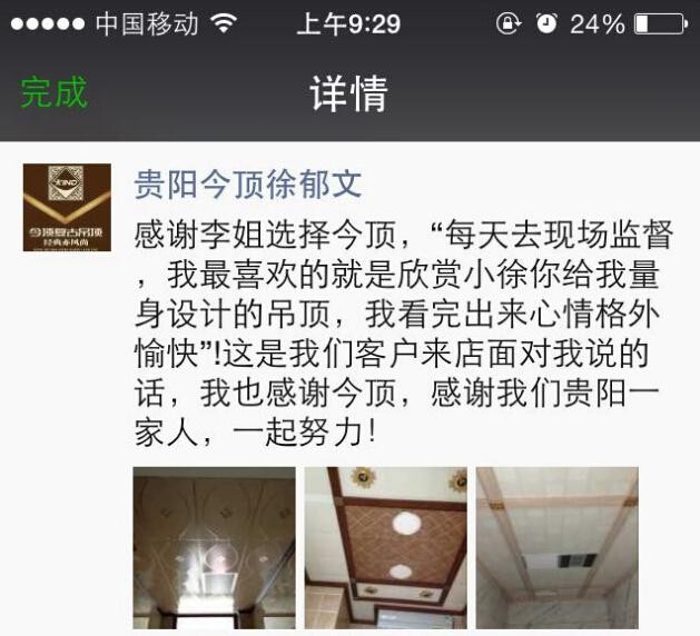“每天去現場監督,我最喜歡的就是欣賞小徐給我量身設計的吊頂,我看完出來心情格外愉快!”這是家住貴陽金陽會展城9號的李女士在朋友圈分享的微信原文。從微信內容看得出,李女士對家里選用的吊頂十分滿意,并急于將這份愉快分享給自己身邊的朋友。究竟是什么樣的吊頂,讓李女士如此心花怒放呢?