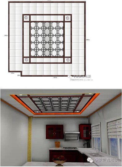 張維微為水墨江南別墅量身定制的中式廚房吊頂方案:四周搭配今頂普通淺色板,并通過躍層主體和直角圍邊營造出落差的層次感,在躍層中運用燈帶作為補充照明,烘托氣氛。中央部分運用五谷豐登板材畫龍點睛,突出中式的主題,內圈四周紅檀色系鋁梁的運用,使整個廚房間中式復古韻味十足。