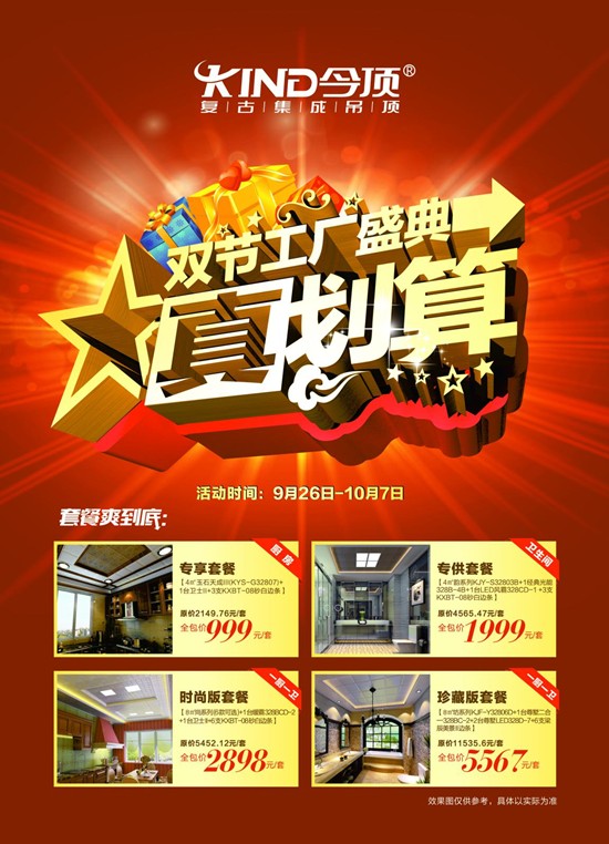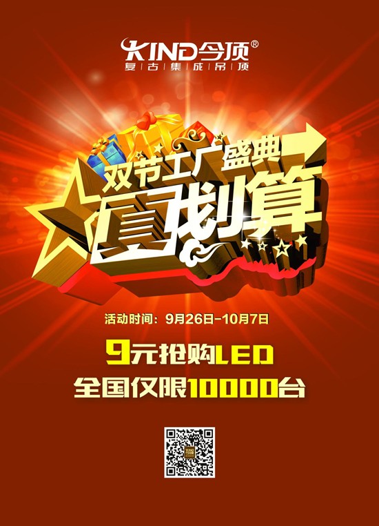 又到金九銀十裝修旺季,今頂復(fù)古集成吊頂全國(guó)1000多家專賣(mài)店將同期開(kāi)展,中秋、國(guó)慶“雙節(jié)工廠盛典,真劃算”聯(lián)動(dòng)終端促銷(xiāo)活動(dòng),與您共創(chuàng)高端、優(yōu)質(zhì)家居生活。