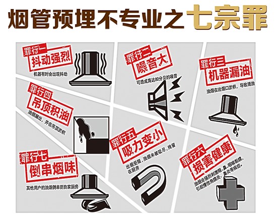 據(jù)不完全統(tǒng)計(jì)60%以上關(guān)于油煙機(jī)的問題,特別是新裝用戶的煙機(jī)問題其實(shí)是煙管沒有預(yù)埋或預(yù)埋不專業(yè)造成的!煙管沒埋好容易導(dǎo)致以下問題:吸油煙機(jī)吸力小;機(jī)器運(yùn)行時噪音大;機(jī)器抖動厲害;使用一段時間后產(chǎn)生漏油現(xiàn)象;公用煙道倒煙串味;吊頂上櫥柜內(nèi)積油;油煙大,影響身體健康。啊?那么嚴(yán)重啊!那該怎么辦呢?