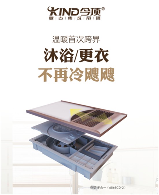 今頂復古集成吊頂尊墅多功能電器憑借其顛覆性的“雙區域共冷暖”功能,摘得“2015年度中國集成吊頂行業十大新品”桂冠!該款尊墅多合一電器在一臺主機即可實現“LED照明、置換空氣、干房暖風、沐浴區冷暖風、洗漱區冷暖風”等七大功能,通過國際領先一鍵切換“旋轉風門”專有技術,能夠解決沐浴區和洗漱區兩個區域的冷暖問題,方便切換,真可謂是“一臺更比7臺強”!
