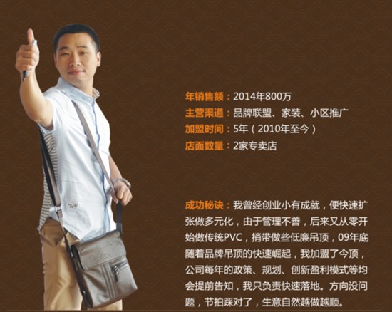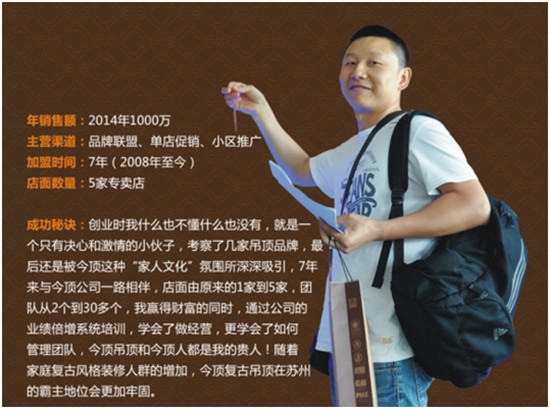 乘互聯網家居起步之勢,今頂順勢而為,強化復古品牌構建和推廣的同時,獨家首創今頂業績倍增盈利模式,專人從專賣店管理規范、銷售激勵系統、終端銷售工具、客戶關系管理系統、精準促銷模式五大核心,覆蓋O2O、家裝、小區、聯盟、會議、風水講堂等全渠道推廣,線上下線緊密互動,協助代理商打造當地復古吊頂第一品牌。