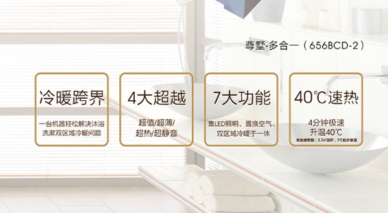 遠(yuǎn)的不說,單說2015年的巔峰產(chǎn)品——尊墅系列,其精益求精的工匠精神就可見一斑。以尊墅多合一(656BCD-2)為例,該產(chǎn)品采用行業(yè)革命性技術(shù)——旋轉(zhuǎn)風(fēng)門技術(shù),成功打破以往浴室取暖只能停留在沐浴區(qū)的窠臼,將暖風(fēng)導(dǎo)入洗漱區(qū),對癥解決了大浴室空間一臺取暖不夠,多臺取暖又浪費的痛點。尊墅電器一鍵切換模式迎合當(dāng)前主流的干濕分離設(shè)計理念,兼顧了沐浴、取暖雙區(qū)域的舒適體驗。
