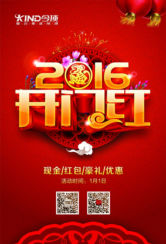 2016開門紅,紅遍祖國大江南北,紅遍祖國大地,紅遍全國今頂!期待已久的2016年1月1日,元旦活動特輯終于來襲!今頂復古集成吊頂全國1000多家專賣店將同期開展“2016開門紅”促銷活動!讓我們一起迎接嶄新的2016,共享新年的優惠盛宴!