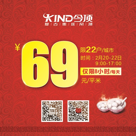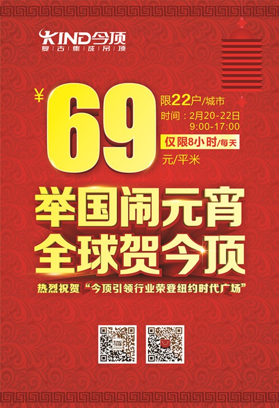今頂集成吊頂在新春佳節、元宵佳節之際,為慶祝今頂榮登紐約時代廣場,今頂復古集成吊頂全國1000多家專賣店將同期開展“舉國鬧元宵,全球賀今頂”促銷活動,以多重好禮回饋老客戶!讓我們一起迎接嶄新的2016,共享元宵的優惠盛宴!