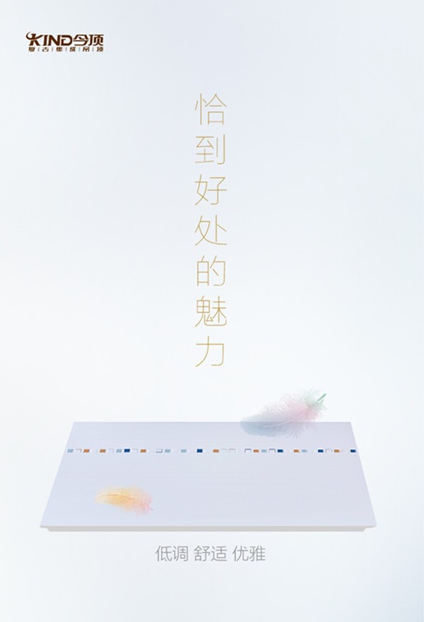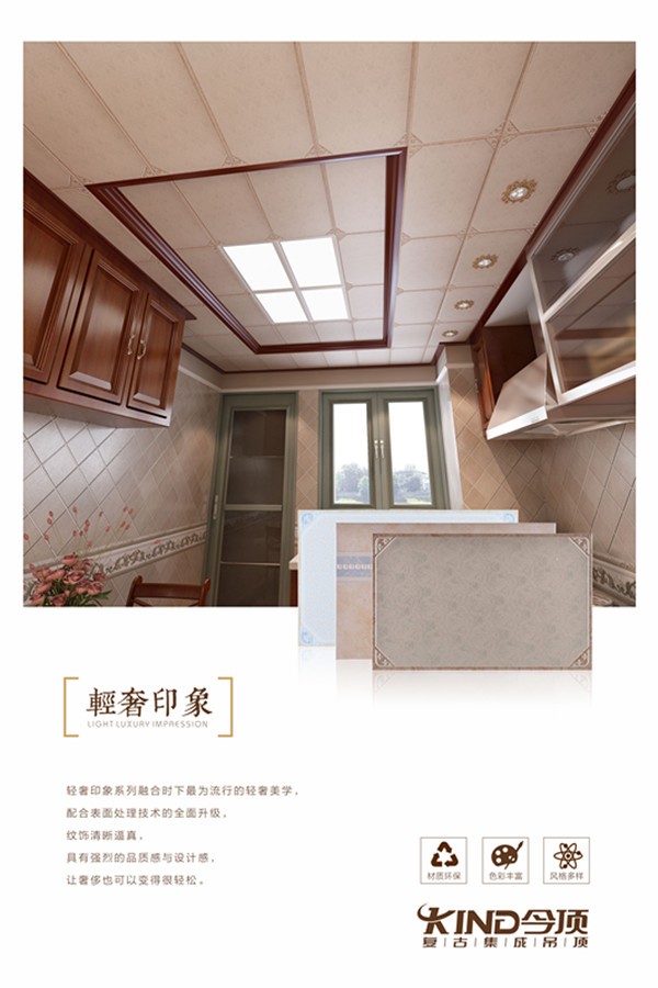 今頂集成吊頂“輕奢印象”系列,以“輕奢華,新時(shí)尚”的生活理念,帶來高品質(zhì)輕奢新體驗(yàn)。本次“輕奢印象”產(chǎn)品依舊保持經(jīng)典時(shí)尚的設(shè)計(jì)理念,力求把世上奢華又具有藝術(shù)感的元素融入進(jìn)產(chǎn)品,為該系列注入高品位的時(shí)尚基因。顛覆集成吊頂板材正方形的傳統(tǒng)觀念,以300*485尺寸全新上市,打破傳統(tǒng)家裝千篇一律的乏味格調(diào),突破畫面的單一,表面一成不變的固有色。搭配各種風(fēng)格,演繹富麗堂皇的金色印象,時(shí)尚清新的淡雅風(fēng)情。今頂把輕奢華印象主義藝術(shù)獻(xiàn)給家的天空,給您帶來“輕奢印象”系列板材。
