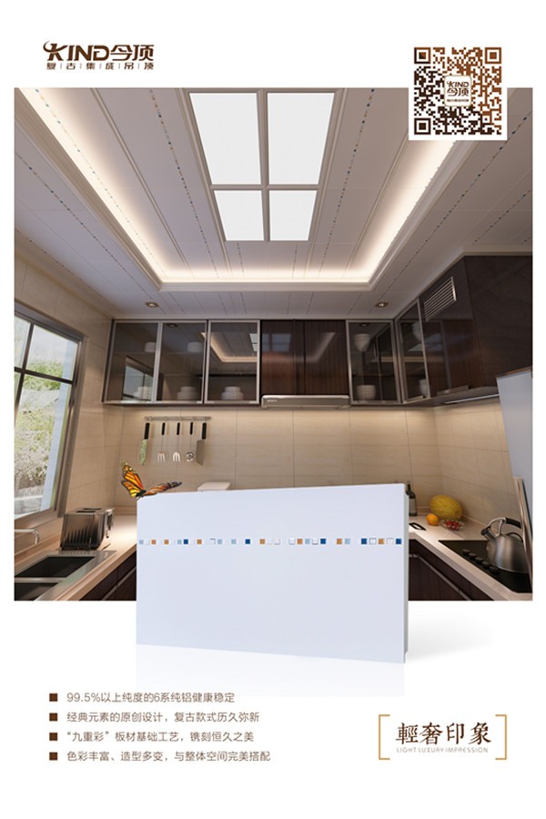 本次“輕奢印象”系列是2016年今頂集成吊頂春季新品“尊雅系列”持續(xù)性延伸產(chǎn)品。依舊采用今頂集成吊頂獨(dú)特氧化及絲印工藝,抗紫外線、色彩均勻一致、紋理清晰逼真、不褪色,健康環(huán)保!獨(dú)具特色的是將板材拉長,300*485全新出擊,打破集成吊頂傳統(tǒng)板材方正理念,讓家的天空拼接有更多的選擇,讓消費(fèi)者成為藝術(shù)的創(chuàng)造者。同時(shí),本系列簡(jiǎn)約時(shí)尚輕奢華,配以花紋點(diǎn)綴,真實(shí)肌理紋路突顯文化沉淀,在光的瞬息萬變中揭示著自然界的奧妙,給人一種自然簡(jiǎn)約又復(fù)古的基調(diào)。