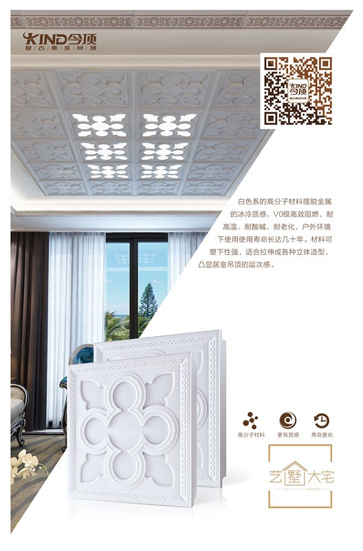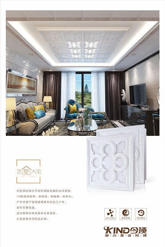 本次“藝墅大宅”系列春季新品面市,汲取歐洲古典建筑文化之精髓,盡顯高端藝術品質。“藝墅大宅”系列采用新型環保高分子材料,白色系的高分子材料擺脫金屬的冰冷質感,V0級高效阻燃,耐高溫、耐酸堿、耐老化,戶外環境下使用使用壽命長達幾十年。材料可塑性強,適合各種拉伸成各種立體造型,凸顯居室吊頂的層次感。同時,根據市場需求,延續“名門大宅”系列,推出板材和照明同系列搭配,讓消費者的選擇更加靈活多變。