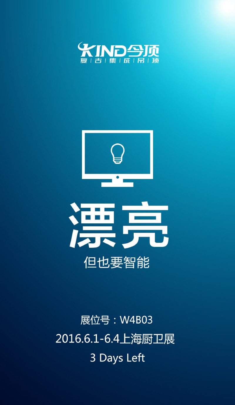 當人類的智慧和行動能力發展成為智能的時候,集成吊頂的智能步伐在人類的帶領下逐漸向我們走來。2016年第21屆中國(上海)國際廚房、衛浴設施展覽會,今頂集成吊頂即將在W4B03展位呈現最聰明、最新潮的產品。