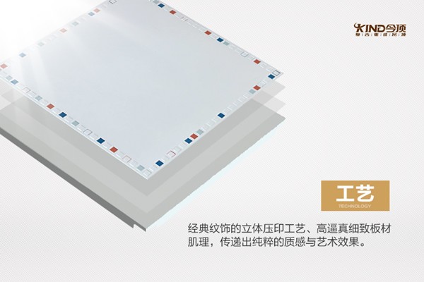 今頂集成吊頂保證完美工藝的同時,安裝縝密排布的扣板,不差一絲一豪的切割,天衣無縫的鑲嵌,用精湛的技藝打造出匠人該有的精神。卓越的工藝質(zhì)感,低調(diào)中隱現(xiàn)璀璨內(nèi)蘊,鐫刻最華美的工藝樂章。把每件產(chǎn)品當藝術(shù)品來雕琢,對細節(jié)和完美的無限追求,今頂致力于為消費者帶來工藝品般的高品質(zhì)產(chǎn)品而努力。